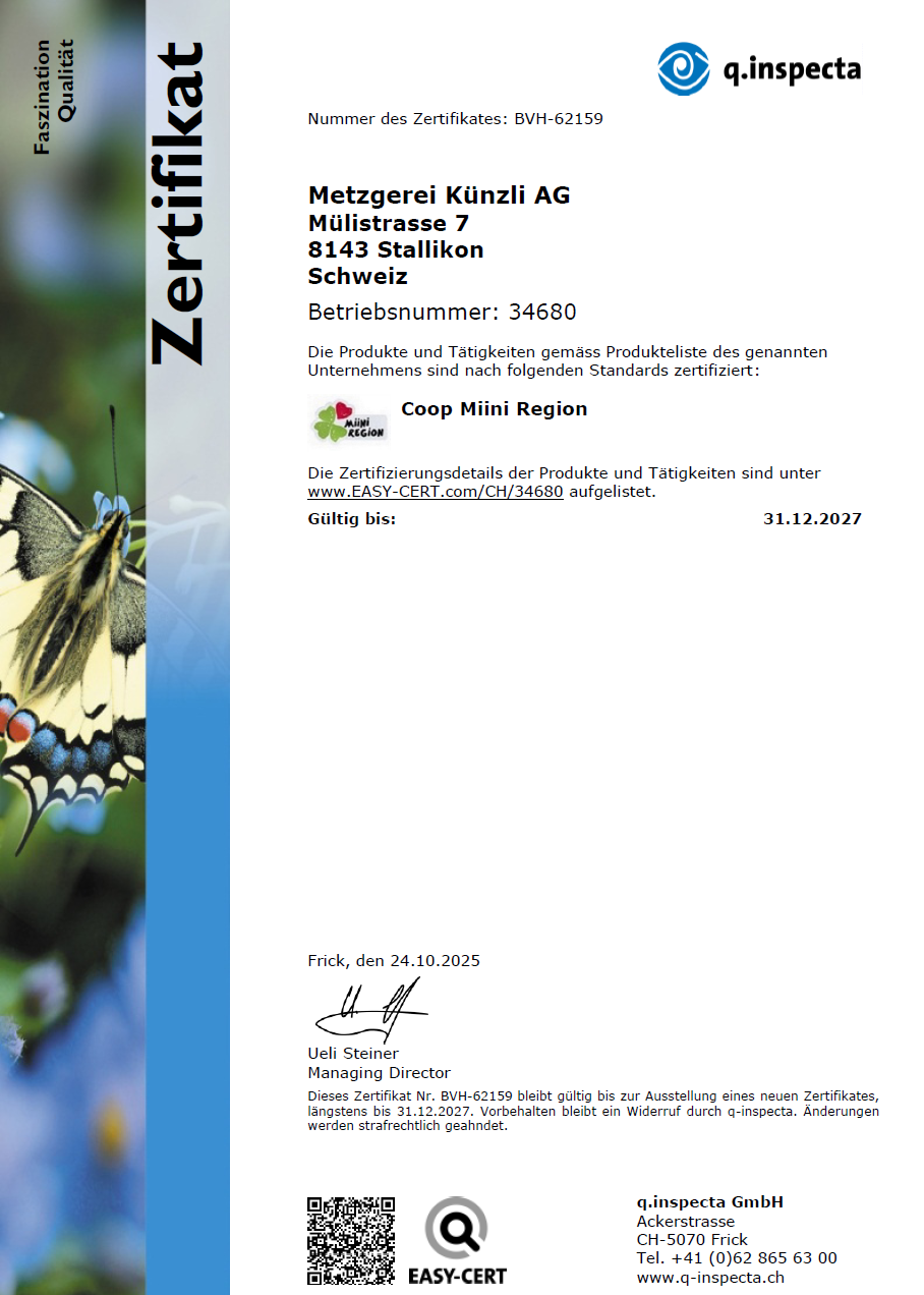 Zertifikate zum PDF Download FSSC 22000 Zertifikat Energie Argentur der Welt Pro Cert Suisse Garantie Coop Miini-Region Pro Cert IP Suisse Tierische Erzeugnisse